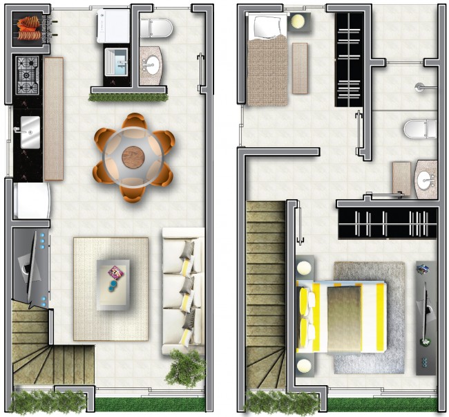 Primeiro pavimento com sala de estar, cozinha e área de serviço conjugada, lavabo e área externa